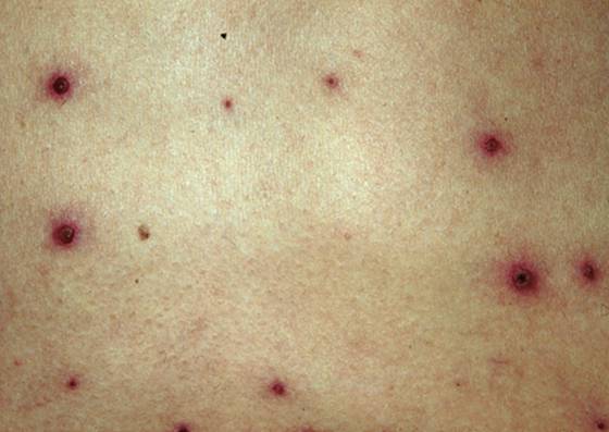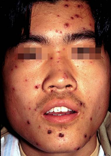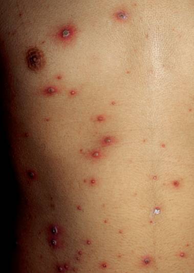 3.皮损特征为同时存在有丘疹、水疱、结痂性损害,典型水疱绿豆大小,周围绕有红晕,结痂脱落后一般不留瘢痕。