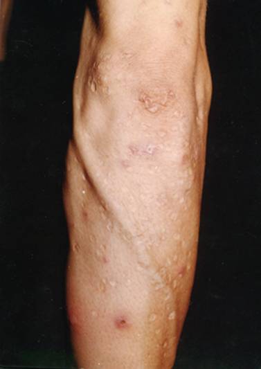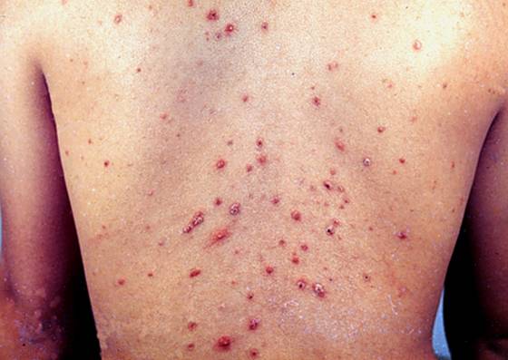 3.基本损害为黄豆大小结节、渐突出皮面,呈暗红色,中心坏死,表面结痂,痂下有凹陷性溃疡,愈后留瘢痕。皮疹常反复发生,成批出现。