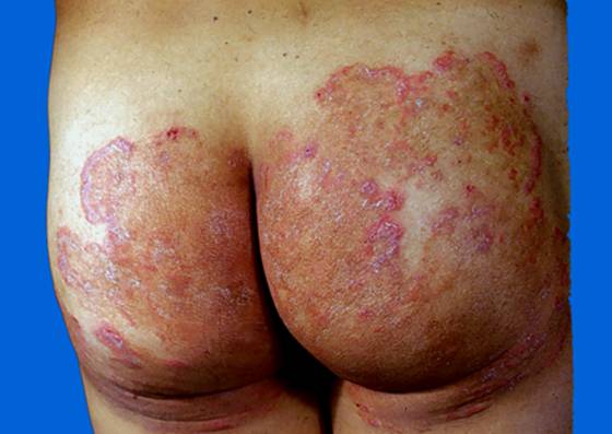 2.皮损多呈环状或半环状斑片,其上有脱屑,并逐渐扩展而向四周蔓延,边界清楚,其上有丘疹、水疱、结痂。中央部位可自愈,有色素沉着或脱屑,历久则于局部皮肤发生浸润增厚呈苔藓化。