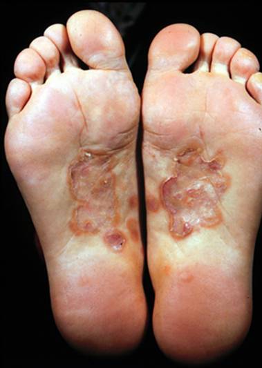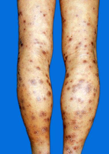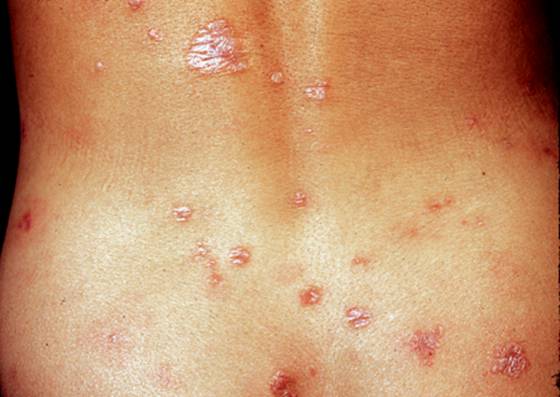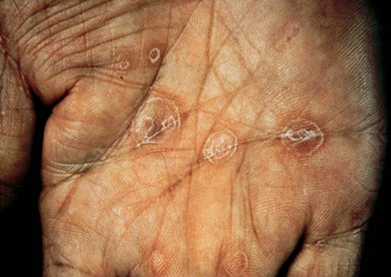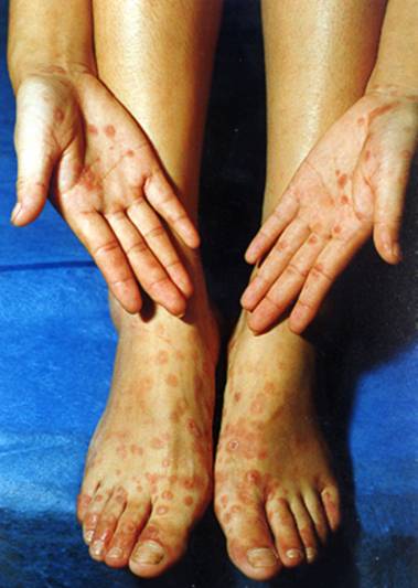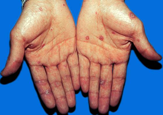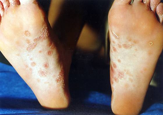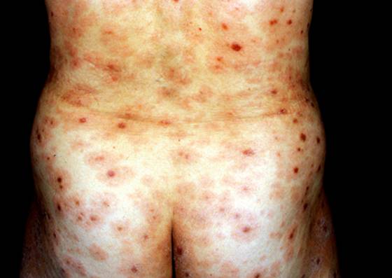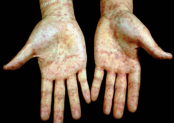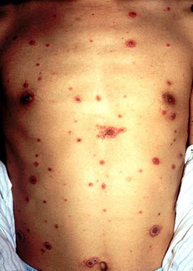 1.皮疹多种多样,可呈斑疹、斑丘疹、丘疹、脓疱疹、鳞屑性皮损等,掌跖部的棕铜色脱屑性斑疹具有特征性。初发二期梅毒疹常泛发全身,对称分布。