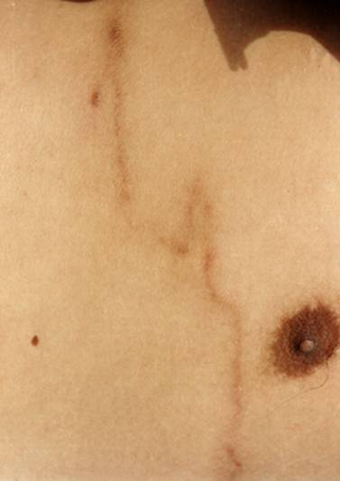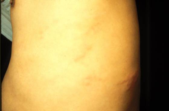2.幼虫钻入皮肤后在原处潜伏数日,在刺入部位出现丘疹、丘疱疹或红斑等非特异性损害。幼虫继续向前直线或蜿蜒爬行,在皮肤上形成鲜红色或暗红色的线状损害,一般为一条,少数呈多发性,略高出皮面。幼虫停止前进后可在局部形成硬结,虫体多停留在损害末端附近。
