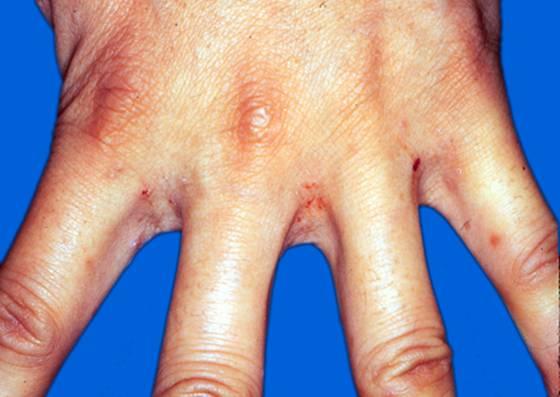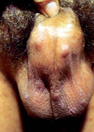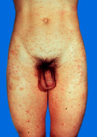 4.男性患者在阴囊、阴茎皮肤上可形成黄豆至花生米大的褐红色结节,伴瘙痒。疥疮治愈后,结节仍经久不消。