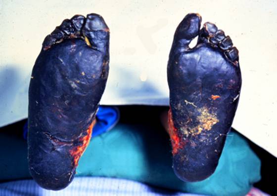 冻伤后仅有皮肤苍白、冰冷、疼痛和麻木,复温后才表现出特征,分为四度;一度冻伤 为皮肤浅层冻伤。局部皮肤从苍白色转为斑状蓝紫色,以后红肿、发痒、刺痛和感觉异常。约1周后,症状消失,表皮渐脱落,不留疤痕。二度冻伤 为皮肤浅层和部分深层冻伤。局部红肿、发痒、灼痛。早期有水疱出现为其特征。如继发感染,经2~3周水疱干涸,形成黑色干痂。痂脱落后,局部由新生上皮覆盖。三度冻伤 皮肤全层和皮下组织均被冻伤。皮肤由苍白渐变为蓝色,再成黑色。感觉消失,冻伤周围组织可出现水肿和水疱。并有剧痛。坏死组织脱落后,创面愈合缓慢,形成疤痕后可能影响功能。四度冻伤 皮肤、皮下组织、肌肉、甚至骨骼都被冻伤。呈暗灰色,伤部感觉和运动功能完全消失。2~3周内成为干性坏疽。