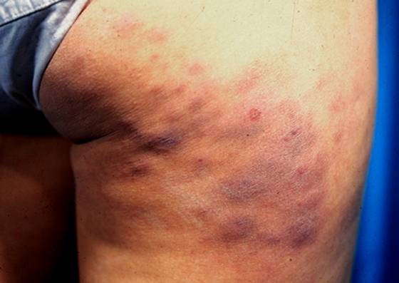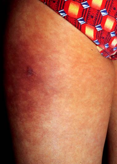 2.临床表现分成多形红斑型、青斑性血管炎型和红斑结节型等。(1)多形红斑型 在股外上方和臀部发生豆大至指头大、圆形、鲜红色水肿性红斑,中央呈暗红或紫红色,境界清楚,轻微隆起,可向周围扩展增大而互相融合,对称分布。(2)青斑性血管炎型 皮疹青紫、暗紫红或青褐色网状斑,表面轻度糜烂,结痂、脱屑,中央具有浅瘢痕。(3)红斑结节型 局部皮肤发生暗紫色或红褐色的红斑或小结节,有时可见淡红色豆大的斑块。
