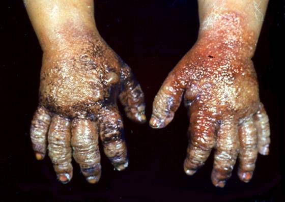 2.面部和手背发生显著的非凹陷性浮肿,表面紧张光亮,质较坚实。双侧眼睑肿胀,使眼睑闭合,不能睁开,口唇外翻,张口受限,皮肤呈弥漫性轻微潮红或呈紫红色,有瘀点或瘀斑、丘疹、水疱等。