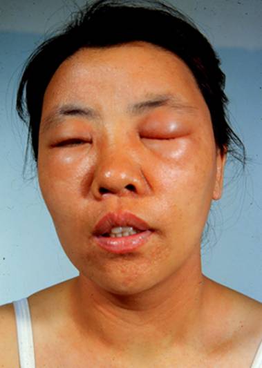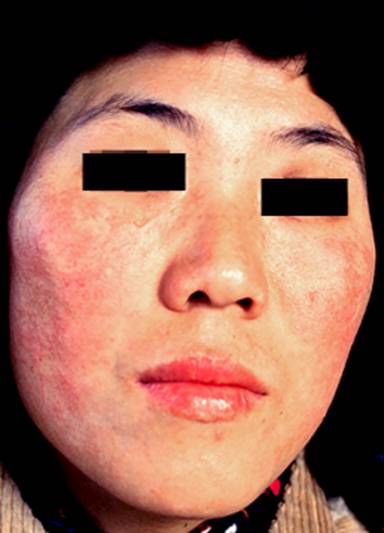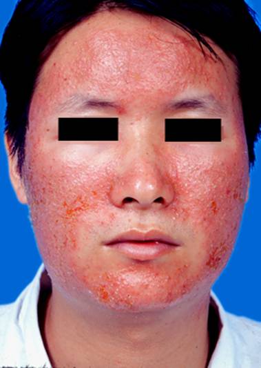 2.皮损主要在涂抹化妆品的部位,如面、颈、眼睑或口唇部。