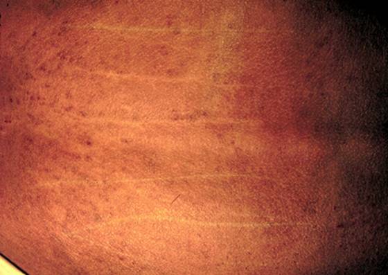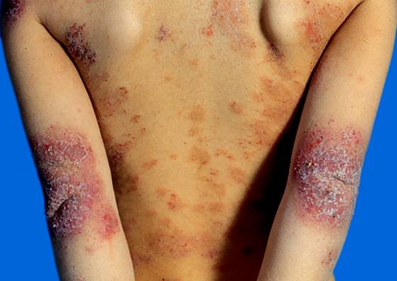 1.皮损有年龄阶段性特点。婴儿期: 表现为典型的婴儿湿疹, 病情较重,渗出明显。儿童期: 主要表现在四肢屈侧呈皮肤粗糙、肥厚、明显抓痕及色素沉着。成人期: 主要表现为慢性苔藓化皮损, 多位于头面部、颈部及肘膝关节屈侧,对称分布, 明显色素沉着, 有明显的抓痕。白色皮划痕阳性。