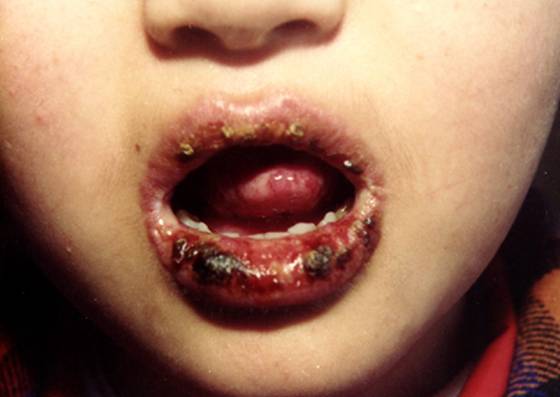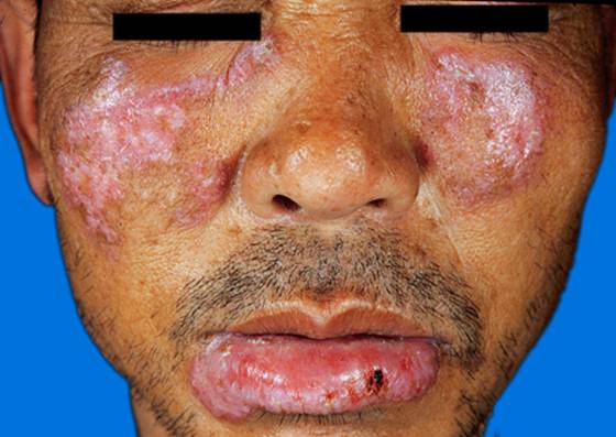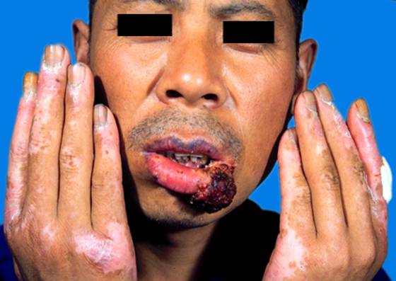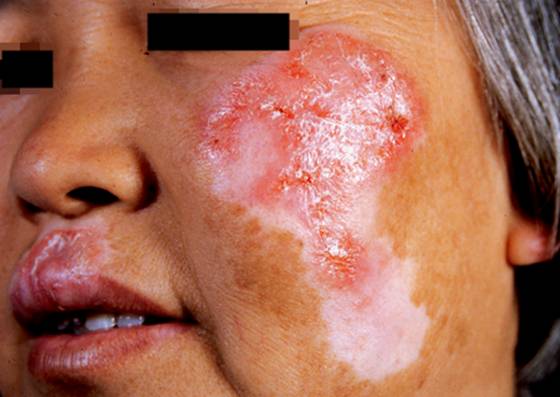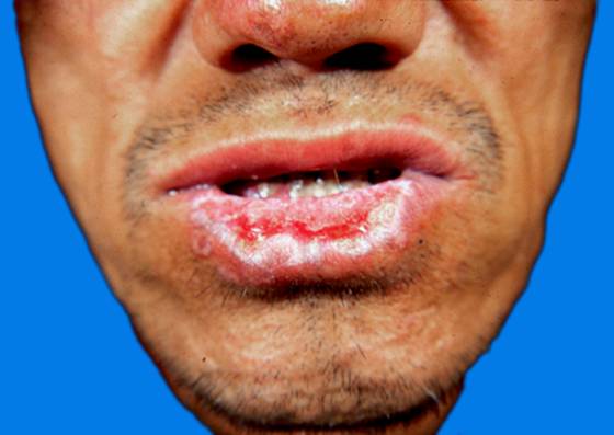 3. 发生于下唇的损害可有糜烂、结痂,长期不愈者可继发鳞状细胞癌,图5。