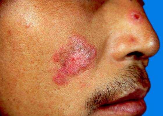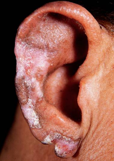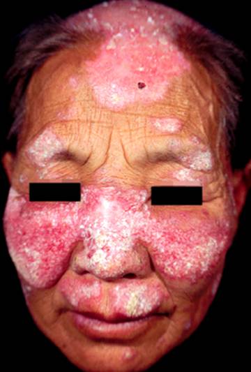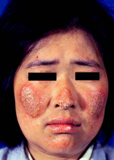 2.皮损好发于面部,为境界清晰的紫红色斑块, 浸润明显,表面有粘着性鳞屑, 剥下鳞屑后可见扩张的毛囊口, 陈旧性者可有萎缩,毛细血管扩张及色素沉着,色素减退。