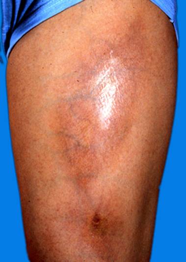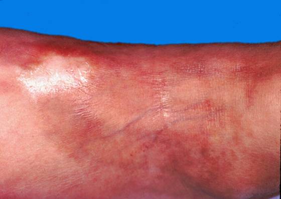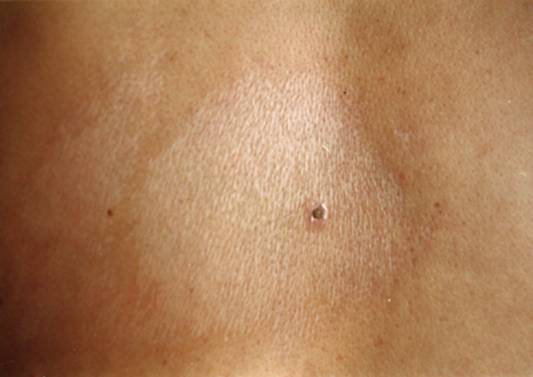 3.皮损早期为轻度潮红、水肿性斑块,而后变为象牙白色或淡黄色椭圆形斑片,周围绕以紫红色晕。皮损表面呈腊样光泽,触之如皮革样硬,其上毛孔稍粗,尤似猪皮状,局部不出汗,无毛发。
