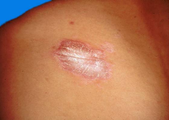 4.数年后皮损软化呈现白色或淡褐色萎缩性疤痕。
