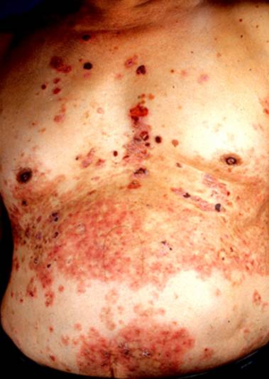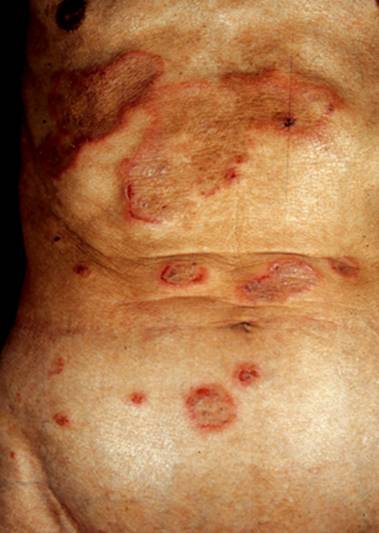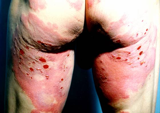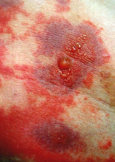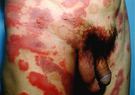 3.皮损为环形、多环形红斑,其上有绿豆大之水疱,疱壁紧张,尼氏征阴性。