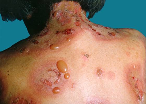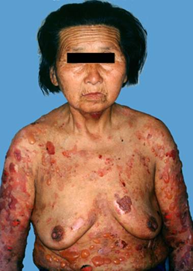 3.基本损害为红斑及正常皮肤上发生大的张力性大疱,疱壁厚呈半球形,尼氏征阴性。