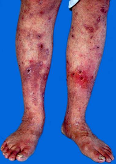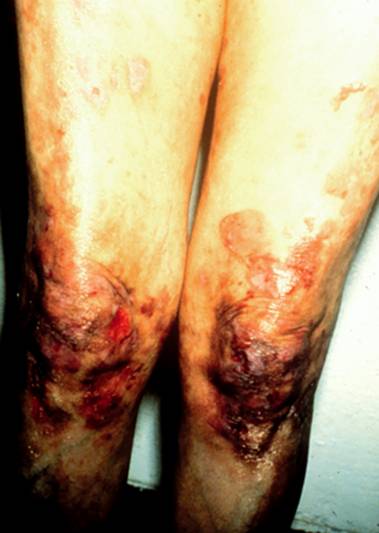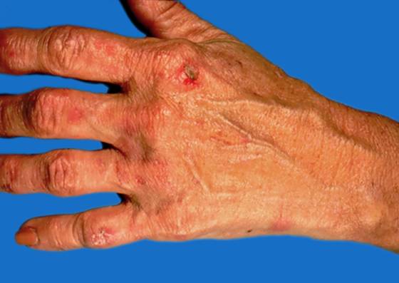 2.皮损好发于手足及肘膝关节伸面,皮肤脆性增加,创伤后易引起大疱,愈后留有萎缩性疤痕、粟丘疹,可伴甲营养不良。