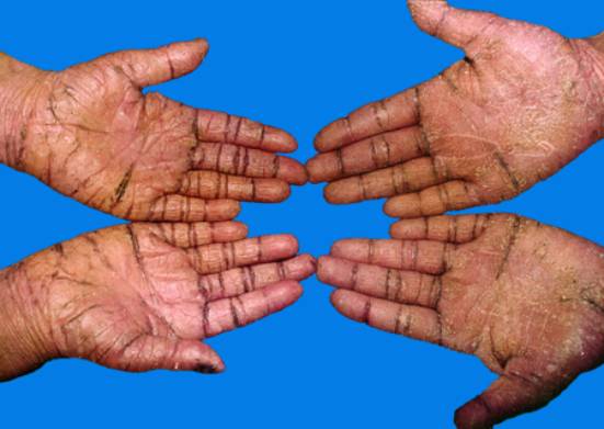 2.皮损为掌跖角化,在手掌、足跖有界限清楚的红斑鳞屑性、过度角化性损害,对称分布。此外,在肘、膝及跟腱处也有角化损害。指甲可有横沟、凹凸不平。