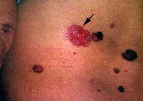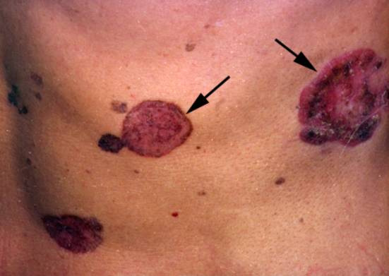 3.主要表现为多发性角化性损害,手掌、足跖有角化过度,有色素沉着,在躯干、四肢有角化性斑片或疣状增生,并有色素沉着。部分砷剂角化可发生Bowen病, 如图中箭头所示。