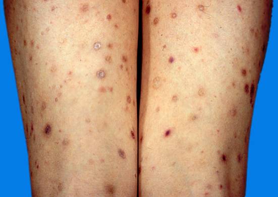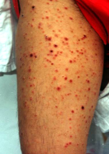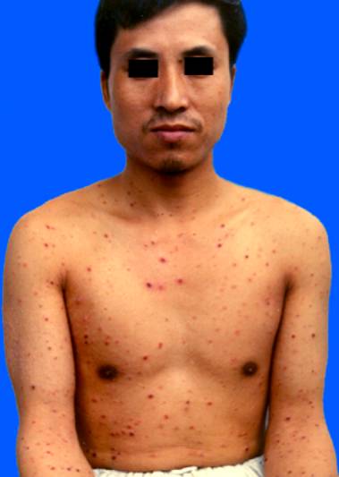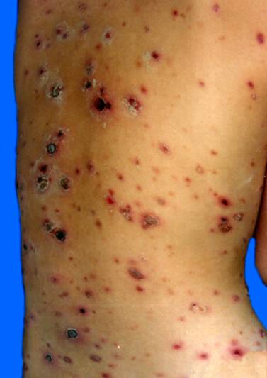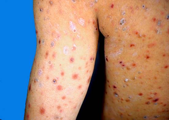 3.急性发病,突然全身皮肤上出现红斑、丘疹、水疱、坏死、结痂等损害,典型为淡黄色或棕红色圆顶丘疹,中央坏死、结痂,愈后可有轻度萎缩性瘢痕,似痘疮。