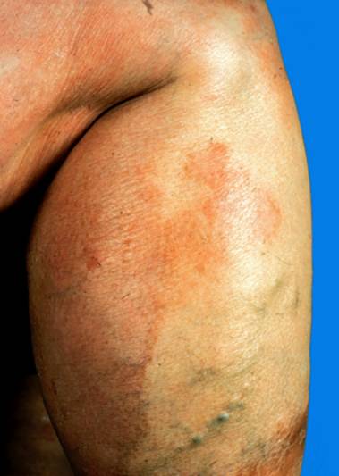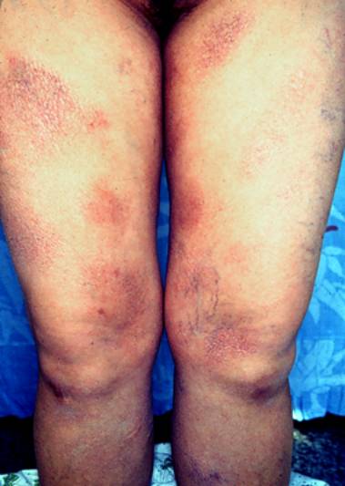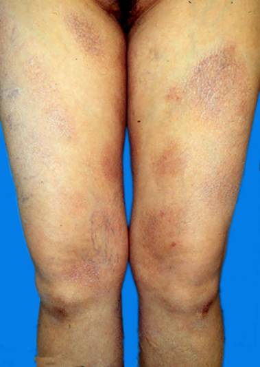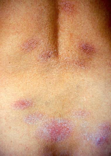 3.皮损多种形态,可以为点滴状、斑片状。常为大小不一的淡红色及黄红色斑,境界不很清楚,无明显浸润,其上被有少量鳞屑。发展较慢,呈慢性经过。