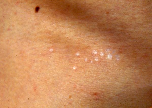 3.皮损初为毛囊性白色角化斑点,呈象牙白色,以后扩大互相融合成象牙白色之角化性斑片。如果发生在外阴及肛门可呈环形或哑铃型排列。经过一段病期后,发生萎缩、变薄,似羊皮纸状。
