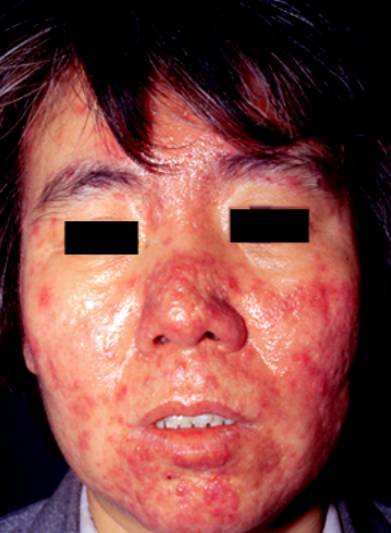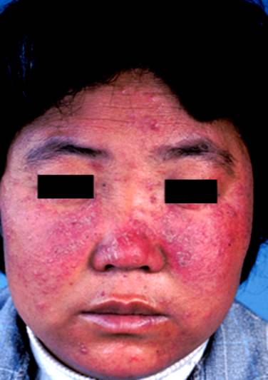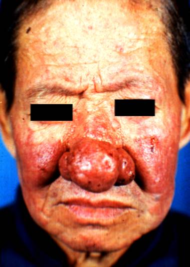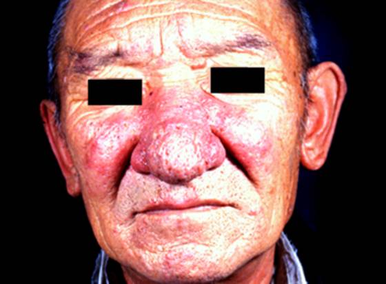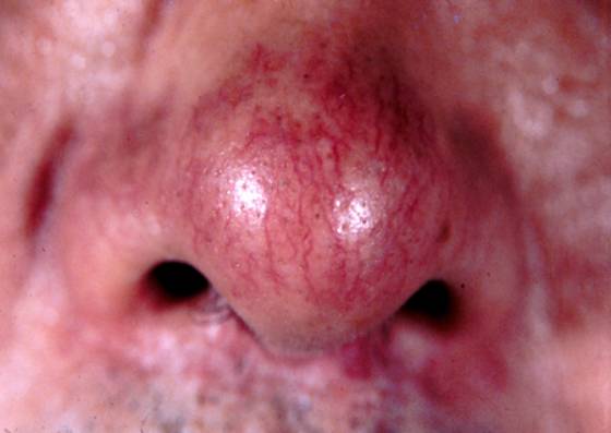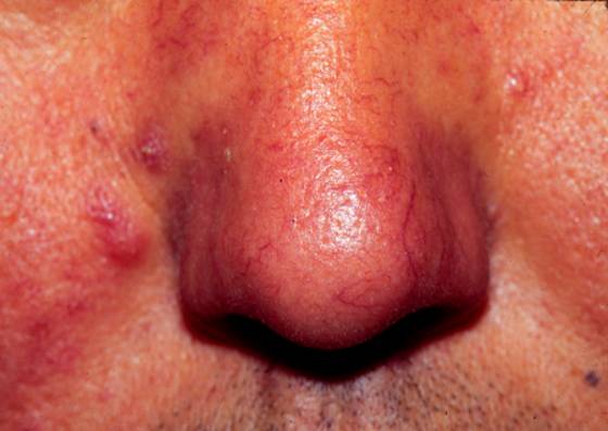 3.临床分三期。红斑期:鼻及其周围皮肤红斑,初为复发性,继而逐渐发展成持续性,伴毛细血管扩张;丘疹脓疱期:在红斑的基础上发生红色丘疹、脓疱,迁延反复;鼻赘期:晚期患者鼻头肥大增生呈结节状,表面毛孔扩张,毛细血管扩张明显。此期仅见于男性。