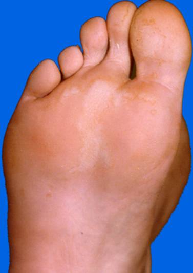 3. 跖部多汗时表皮浸渍发白,常伴臭味。