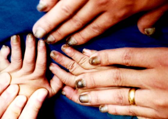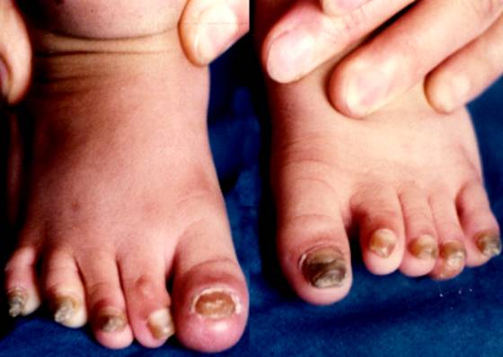 4. 损害于5岁内逐渐加重。因甲沟反复继发感染而引起病甲脱落。