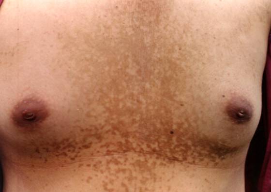 1. 多为女性,皮损好发于两乳房间和背部中间区域。