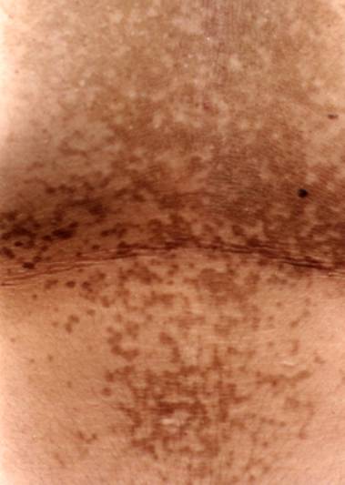 2.初为5mm左右的扁平丘疹,褐色,表面疣状或乳头瘤状。皮损逐渐增多,融合成不规则状及网状;紧密融合成片状者称钱币状融合性乳头瘤病。