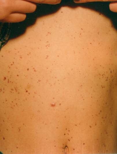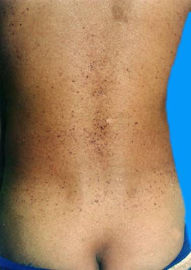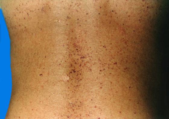 3.皮损为数量不等的2~4mm暗红色或黑色斑疹、丘疹,压之不退色。