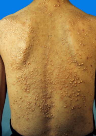 2.主要症状声音嘶哑,舌增厚,质硬,检查见咽、会厌、声带有黄色结节。幼年时面部黄棕色小结节,眼睑缘有念珠状丘疹,眼睑增厚,肘膝关节部黄瘤样损害。成年期病情稳定。