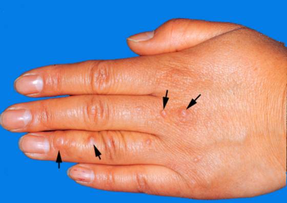 3. 损害为丘疹、结节或斑块,直径0.5至数公分,数目不定,皮色,象牙白或紫红色;质地较硬,可有疼痛。