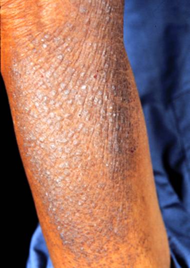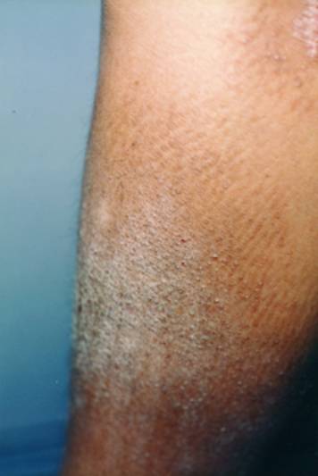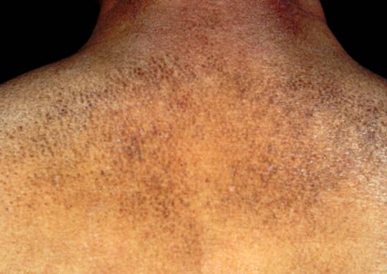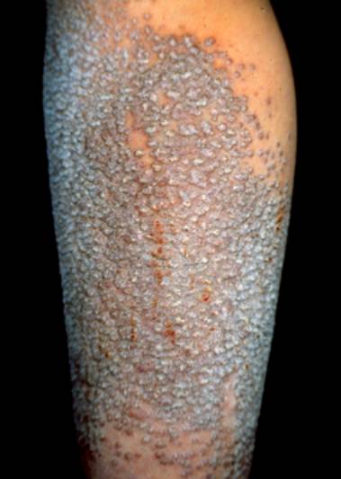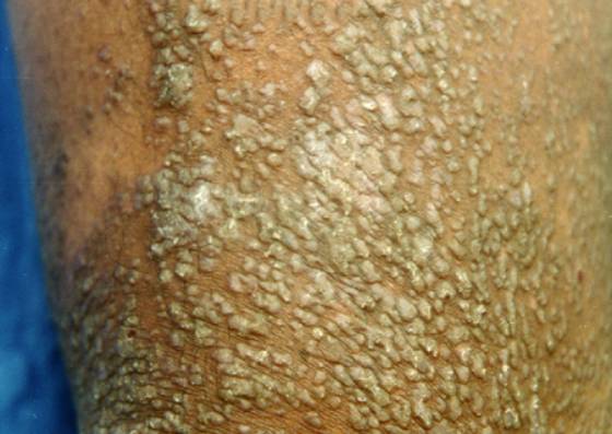 2. 典型损害为2mm左右坚实丘疹,半球形,表面粗糙、角化或光滑,淡褐色。