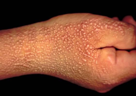 2. 典型皮损为淡红色及黄色丘疹,0.2~0.4cm, 表面光滑,密集成群似苔藓样。