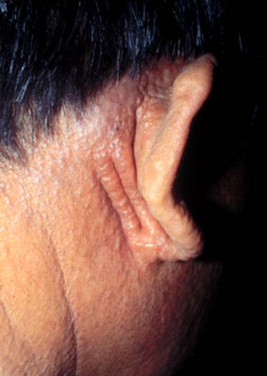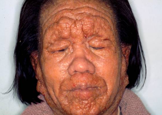 4. 硬化性粘液水肿皮损好发于面部,特别是前额、手背,形成弥漫性浸润增厚,甚至形成狮面样面容。