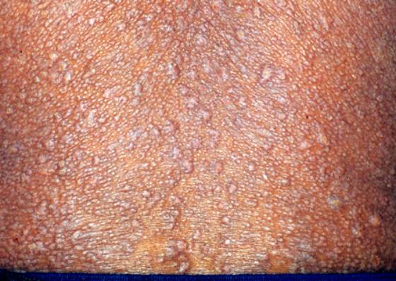 粘液水肿性苔藓(lichen myxedematosus)是因皮肤中纤维母细胞增生和酸性粘多糖过度沉积而引起皮肤苔藓样丘疹为特征的皮肤病。原因不明,皮损是异常球蛋白沉积的结果。临床分为全身苔藓样型,限局苔藓样斑块型,散发丘疹型及硬化性粘液水肿等。