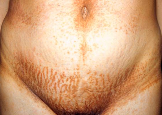 3. 皮损好发于前臂伸侧、面部、手背及躯干,可泛发,但常限局,排列成斑片状,线状,环状。+