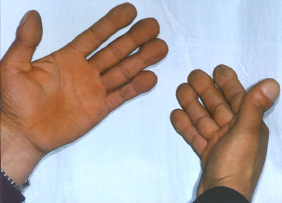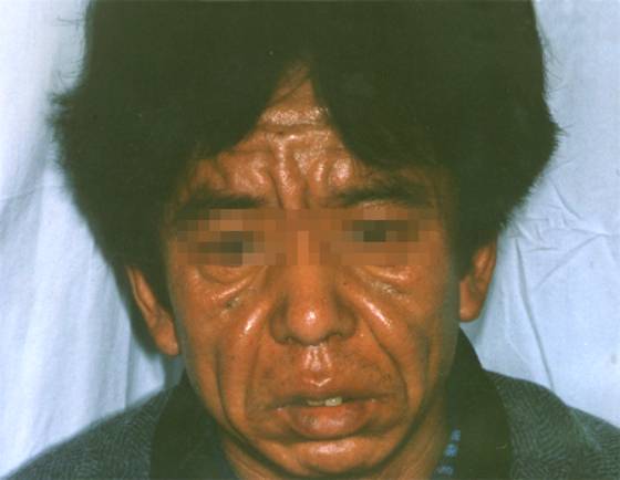 2. 成年者发病表现为皮肤弥漫性肥大增厚。面部皮肤纹理增粗,皱纹加深,鼻唇沟增宽,舌、口唇变厚。