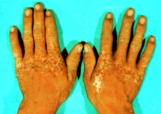 2.两侧手足背对称性多发性色素脱失斑,其中心为岛状淡褐色斑。