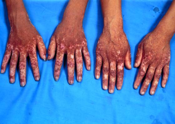 3.皮疹可蔓延至前臂及小腿,成网状,面部伴雀斑样损害。