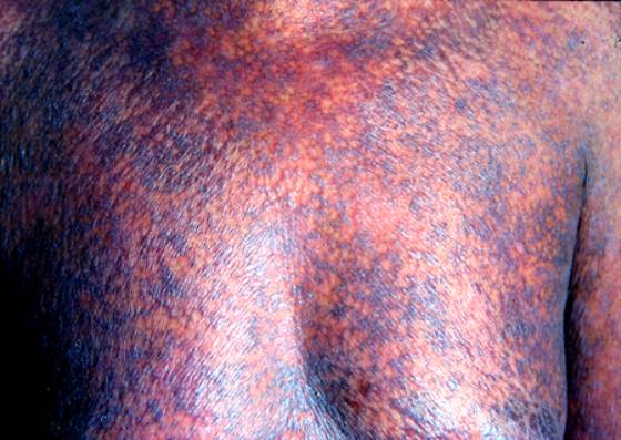 其它全身性疾病伴发色素沉着(hyperpigmentation with systemic diseases)是指因其它疾病引起的皮肤色素沉积。这些疾病包括疟疾、黑热病等慢性感染、恶性肿瘤、中枢神经系统疾病、结缔组织病、肝肾疾病、血液病、维生素缺乏及营养不良等。某些物质,如重金属等过多进入体内,亦可引起广泛色素沉着。本图显示蕈样肉芽肿患者躯干异色样皮损,有明显网状色素沉着。