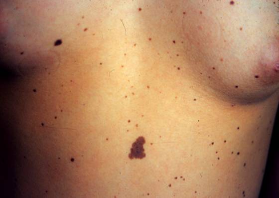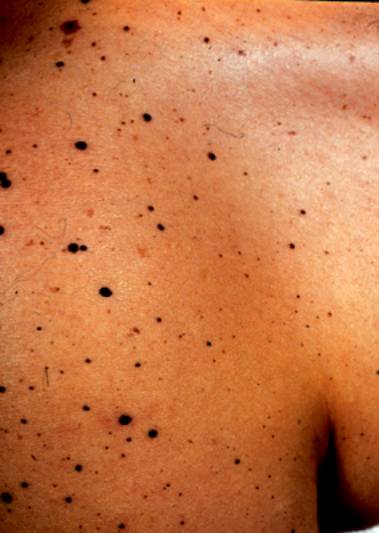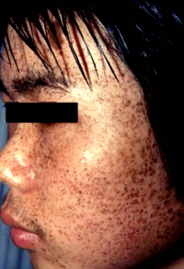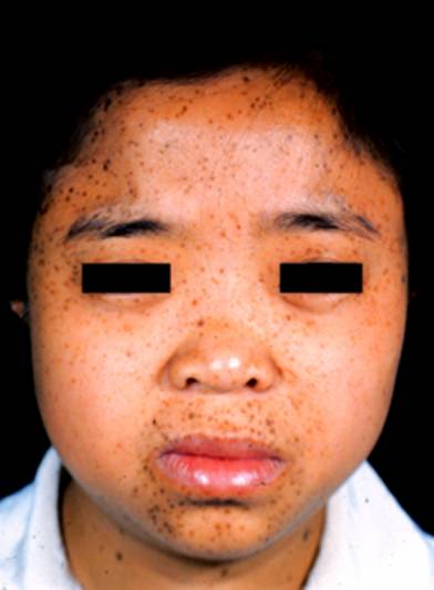 2. 躯干、颈部、头面、四肢出现多发性黑子,粘膜不受累。