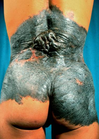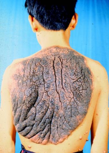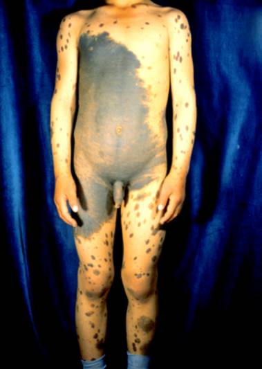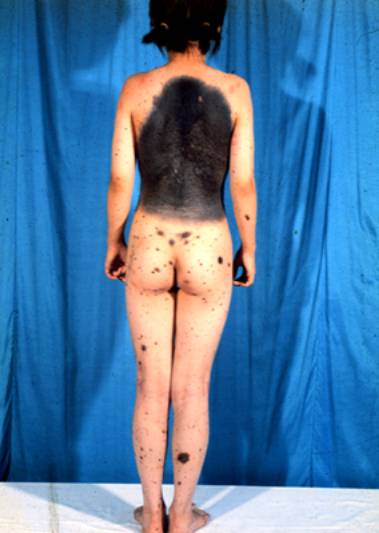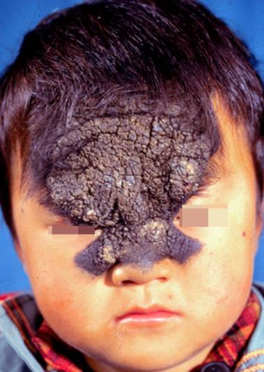 1.皮损大小不等,一般比后天性色素痣大,直径多大于1cm,有时皮损累及躯干大部或某一肢体,伴局部多毛,称兽皮样痣。