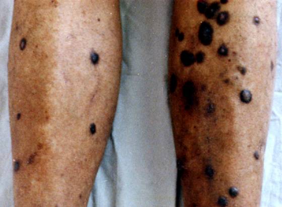 1.普通型蓝痣多为蓝色及蓝黑色结节,直径2~6mm,幼年发病,好发于上肢和面部,一般单发,少数病人多发,图2。 生长缓慢,终生不退。