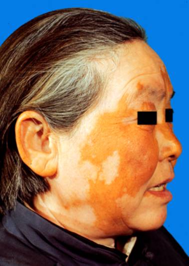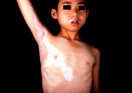 3.白斑分布呈多样性,可对称分布,亦可单侧按皮节及某一皮神经分布,可较限局,也可泛发,有同形现象。