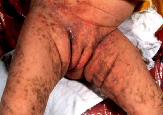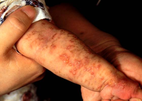 1.红斑水疱期 生后一周左右发病,主要是躯干、四肢屈侧红斑、水疱,持续2个月左右。