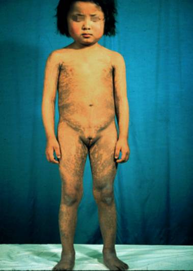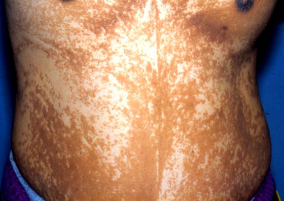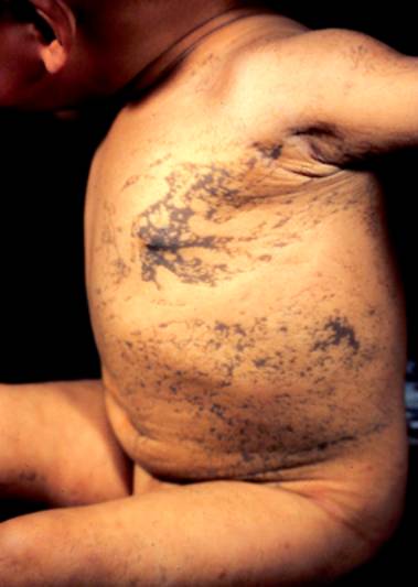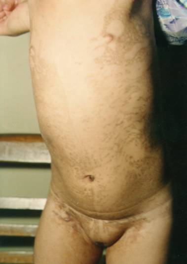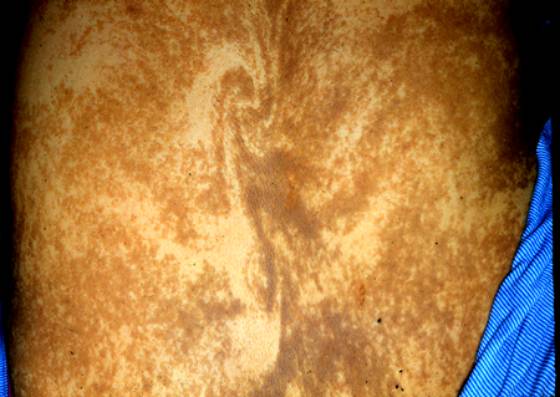 3.色素失禁期 原皮损区出现淡褐色及褐色斑疹和斑片,形状不规则,有些似旋涡状或泼墨状,数年后可逐渐消退。