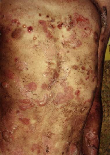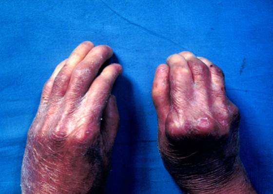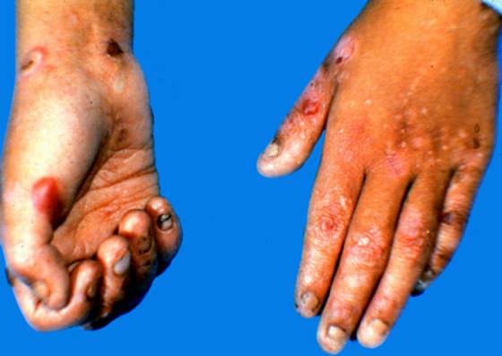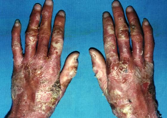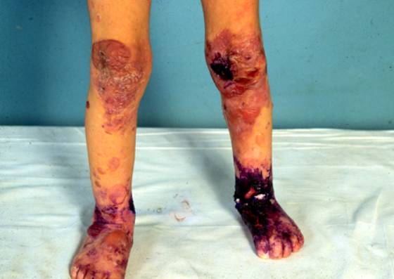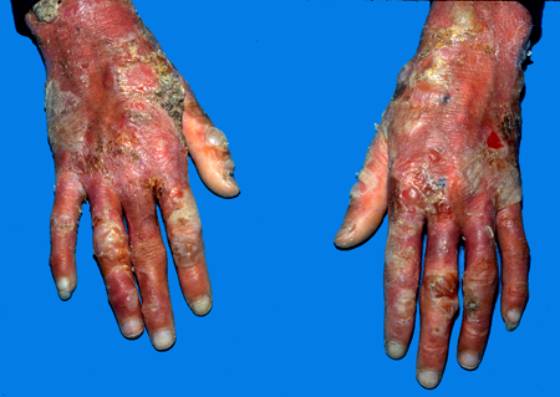 1.四肢伸侧,尤其是手指、腕、踝、肘、膝等易摩擦处反复张力性大疱、血疱,愈后留有萎缩性瘢痕,粟丘疹常见,皮肤呈皱纹纸样,严重时肢体挛缩,活动受限。