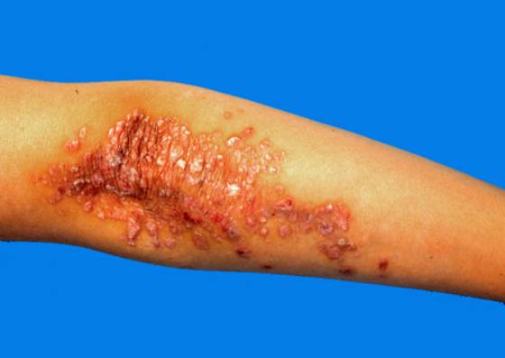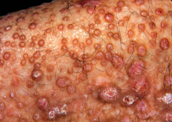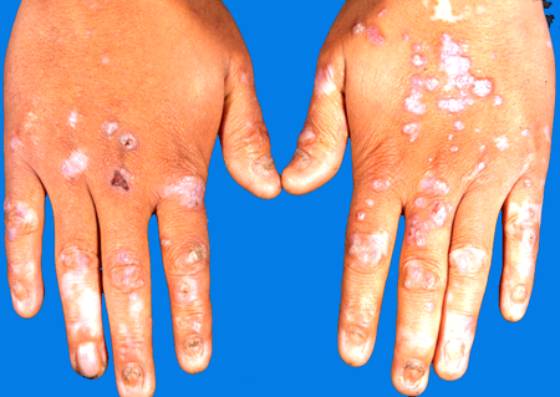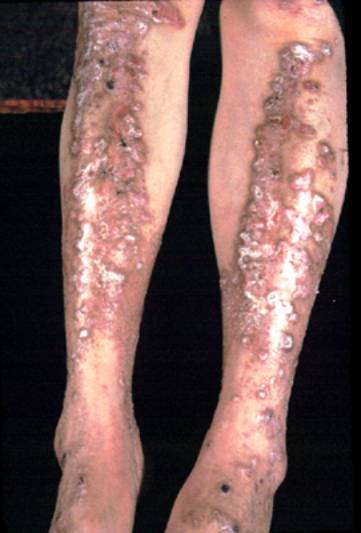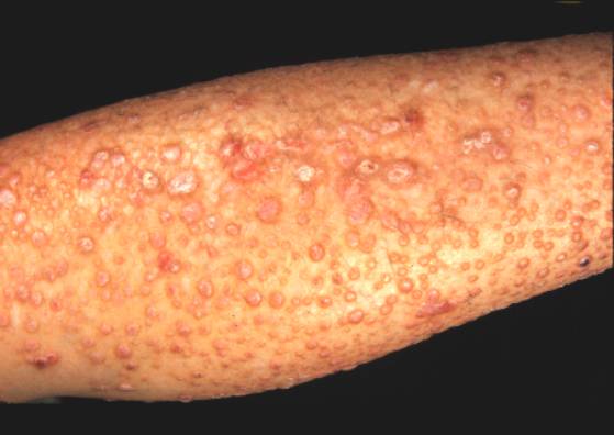 4.特征性损害为白色丘疹,多于发病后5年出现,水疱愈后发生3~5mm的瘢痕性白色丘疹,以胫前最明显。