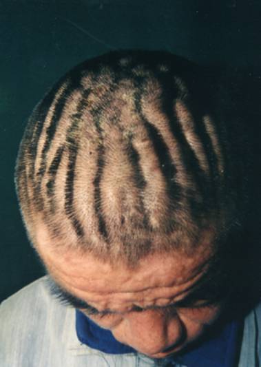 2.头皮发生皱叠及凹陷性沟嵴,2~20个沟嵴不等,分布对称,沟宽约1cm,外观不规则似脑回状,其上头发正常。