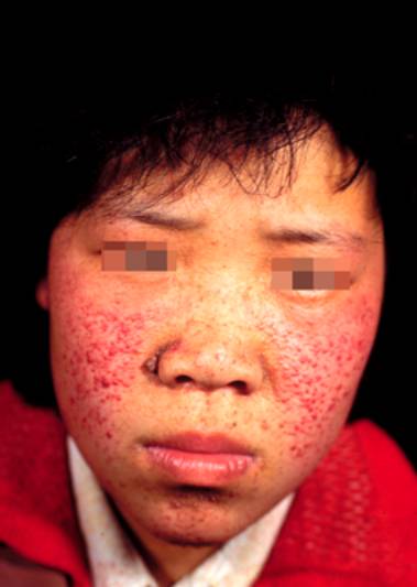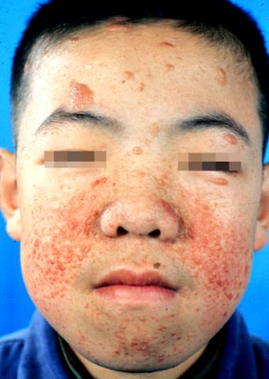 2.血管纤维瘤(即Pringle 皮脂腺瘤)表现为鼻唇沟、颊部及下颏为主散在多发性红黄色小丘疹, 一般1~5mm大小,表面光滑,伴毛细血管扩张。